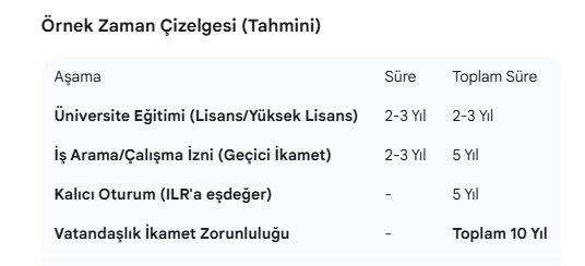Normal Yol: Mezuniyet sonrası nitelikli bir işte 2 yıl çalıştıktan sonra süresiz oturum (Niederlassungserlaubnis) başvurusu yapılabilir. (Kanada'daki PR'ın karşılığı).