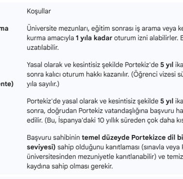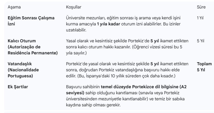Portekiz, üniversite eğitimi sonrası kalıcı oturum/vatandaşlık sürecinde (toplam 5 yıl), İspanya'ya (toplam 10 yıl) göre uluslararası öğrencilere çok daha hızlı bir yol sunmaktadır.