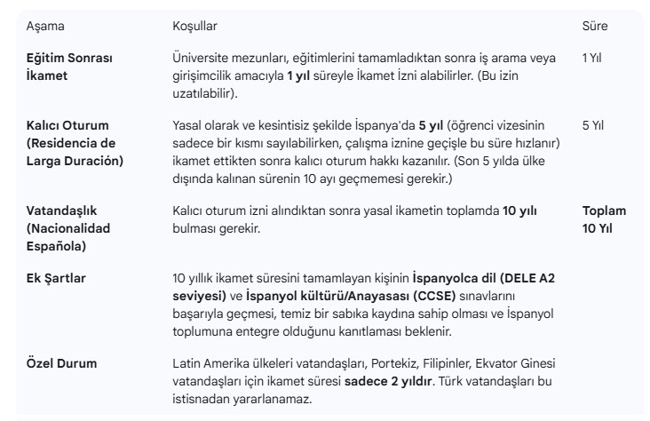 İspanya, uzun süreli ikamet sonrası vatandaşlık modelini uygular ve dil/kültür bilgisine önem verir.