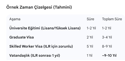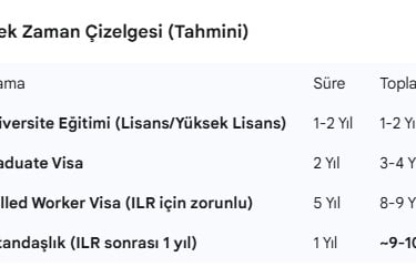 Özetle: İngiltere'de mezuniyet sonrası vatandaşlık yolunun anahtarı, Graduate Visa'yı, bir işverenin sponsor olduğu Skilled Worker Visa'ya başarılı bir şekilde dönüştürmektir. Bu sponsorluğu bulmak, Kanada veya Avustralya'daki puan tabanlı sistemlere göre daha büyük bir belirsizlik ve zorluk içerebilir.